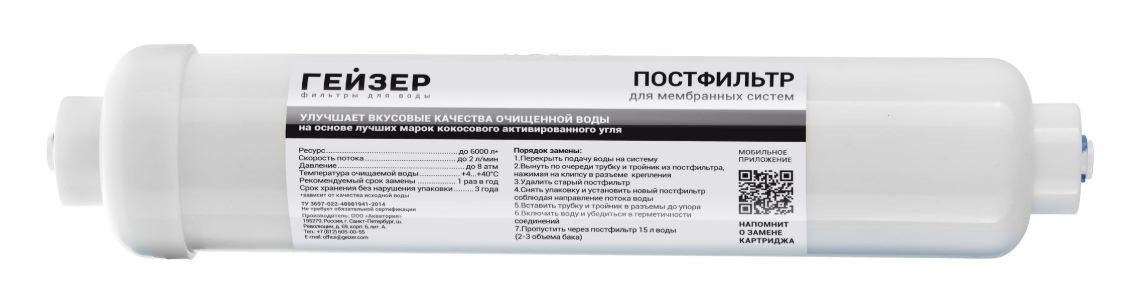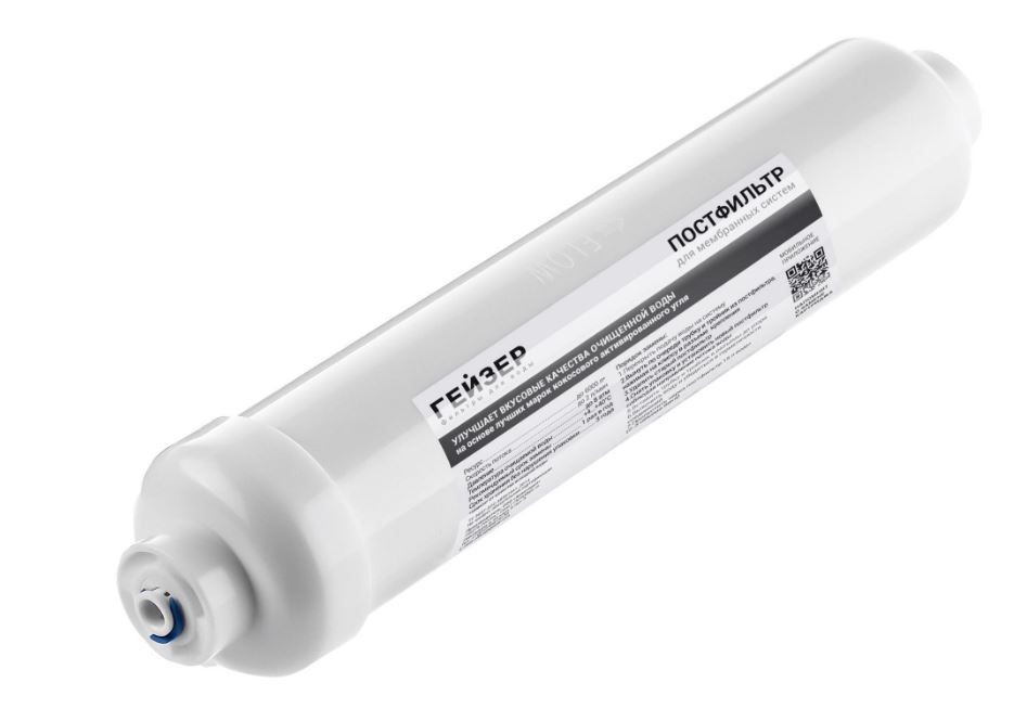 На основе лучших марок активированных углей для финишной доочистки и кондиционирования воды в системах обратного осмоса серии Гейзер Престиж.В бытовых системах мембранной ультра- и нанофильтрации на заключительном этапе водоочистки используют угольный постфильтр, который обеспечивает подачу вкусной и свежей воды из крана даже после длительного перерыва в пользовании. Картридж сорбционного типа эффективно устраняет неприятные привкусы и запахи, появление которых возможно из-за застойных явлений в накопительной емкости и присутствия в воде растворенных газов. В качестве сорбента используется уголь из скорлупы кокоса, прошедший активацию при нагреве свыше 850ºC для раскрытия пор и увеличения площади сорбции. Угольный постфильтр рассчитан на очистку 6 кубических метров жидкости, а после исчерпании ресурса он легко заменяется.