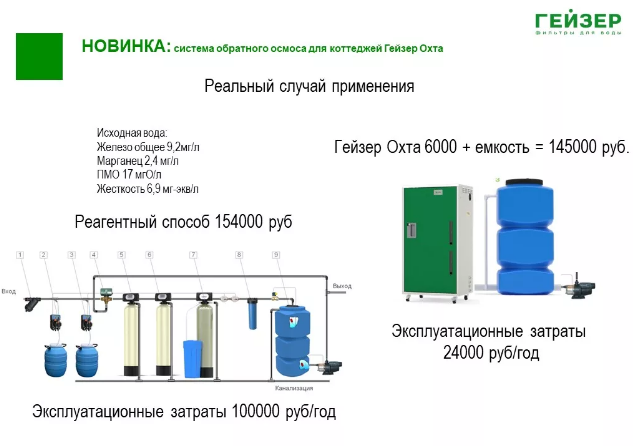 ГАРАНТИЯ КАЧЕСТВА - В отличии от реагентного метода очистки воды (засыпные колонны) мембраны обратного осмоса системы Гейзер Охта 6000 обеспечивают стабильную глубокую очистку воды от широкого спектра загрязнений, котораяне зависит от сезонного изменения состава исходной воды.