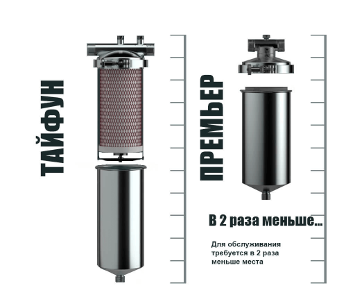 В отличие от корпуса Тайфун, для для обслуживания и замены картриджа не нужно дополнительное пространство. Это позволяет устанавливать фильтр в меньшие по размеру места (ниши).