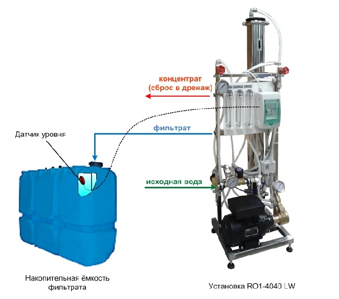 Фильтрат (обессоленная вода) поступает непосредственно потребителю или в накопительную емкость. Поскольку сквозь мембрану под действием давления свободно проходят молекулы воды, но практически полностью (на 97-99,5 % в зависимости от типа используемых мембран) задерживаются солеобразующие ионы: Na+; Са +2; Fe+2; Mn+2; NH4+; SO4 -2; Cl-, и тем более крупные молекулы и частицы, то фильтрат не только свободен от механических примесей и растворенных солей, но и стерилен, так как мембрана не пропускает бактерии и вирусы. Для улучшения работы установки при высоком содержании солей двухвалентного железа и солей жесткости в воду рекомендуется предварительно дозировать ингибитор осадкообразования, препятствующий выпадению в осадок малорастворимых солей.