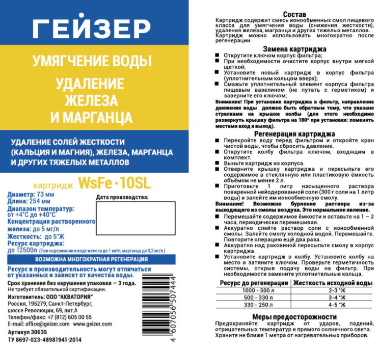 - Ресурс картриджа до 12500л (при содержании железа до 1мг/л, марганца до 0,2 мг/л)