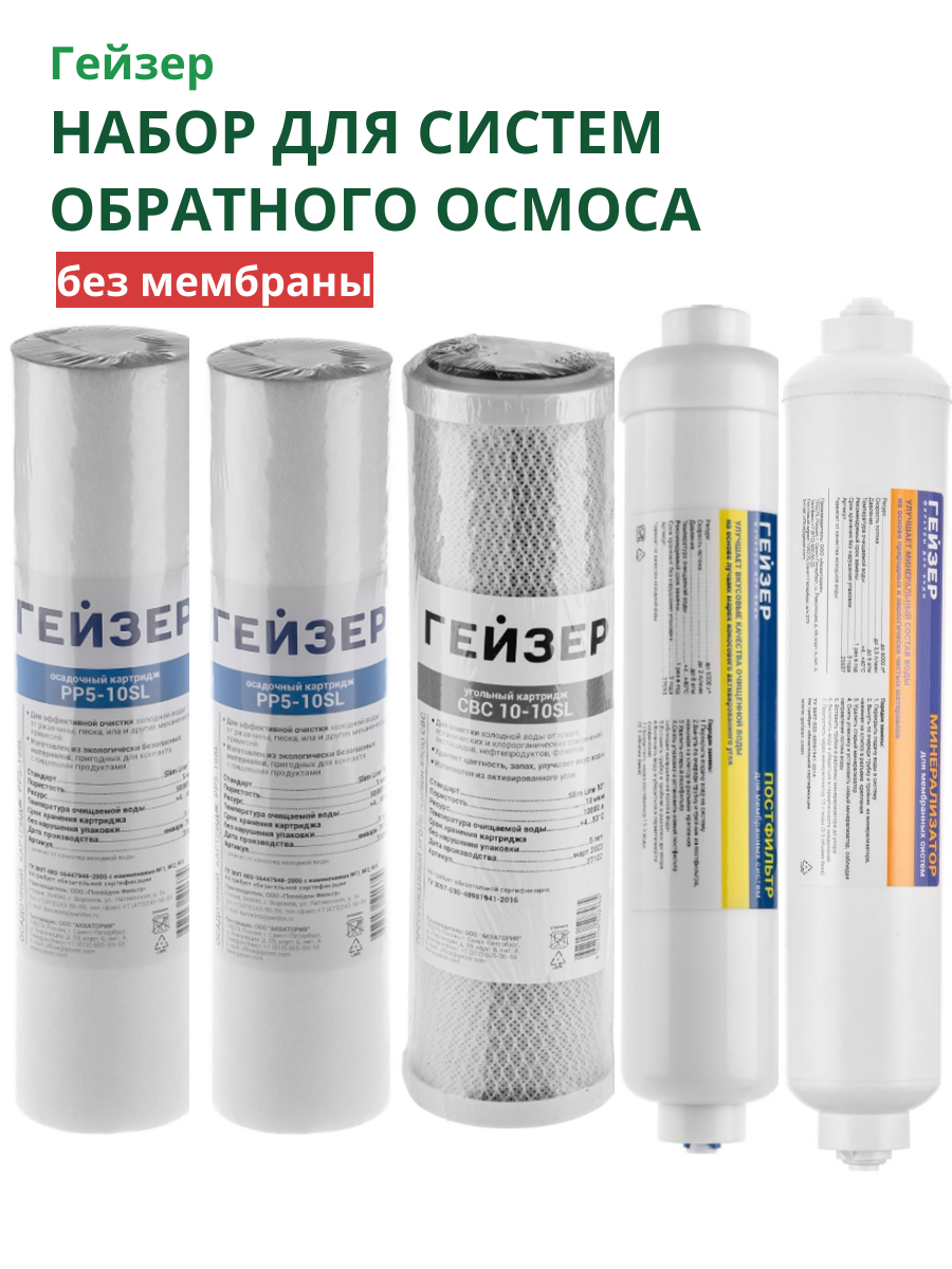Набор картриджей подходит для Гейзер Аллегро М, Аллегро ПМ (с минерализатором, без мембраны, 5 предметов)Набор картриджей для замены 6-ти ступеней очистки в стандартном обратном осмосе.