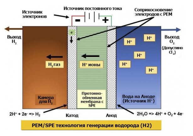 Процесс производства газа H2 с помощью технологии PEM/ SPE: