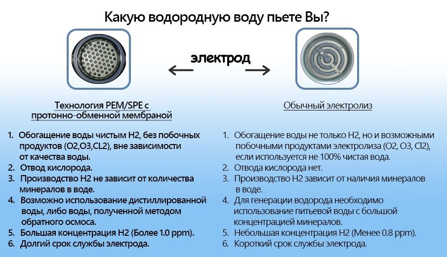Ионизаторы воды и водородные генераторы первого поколения, в отличие от водородных генераторов, выполненных по технологии SPE/PEM, изменяют уровень рН воды, что может оказывать негативное влияние на организм человека в зависимости от возраста и состояния здоровья, а также они производят заметно меньшее количество водорода