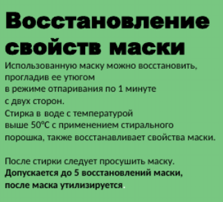 Рекомендуем менять маску не реже, чем каждые 3 часа. Использованную маску прогладьте утюгом в режиме отпаривания по 1 минуте с двух сторон или постирайте в воде при температуре выше 50°С с применением стирального порошка. Допускается до 5 восстановлений маски, затем ее следует утилизировать. Утилизация маски возможна с бытовыми отходами (рекомендуется предварительно поместить её в герметичный пакет).