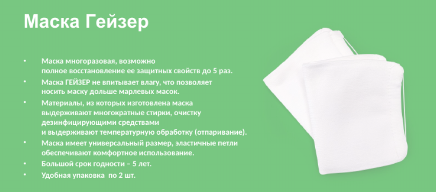 Многоразовая санитарно-гигиеническая маска Гейзер применяется в бытовых условиях при наличии в воздухе пыли, аэрозолей и инфекций, передающихся воздушно-капельным путём. Маска имеет три слоя защиты, изготовлена из нетканого гипоаллергенного материала, подлежащего восстановлению.
